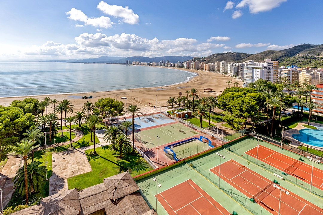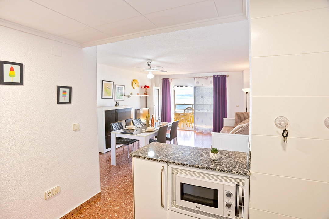 Disfruta de este alojamiento en primera línea de playa, con vistas al mar desde su balcón y acceso a un amplio patio comunitario, perfecto para pasear, relajarte o disfrutar del sol. El residencial ofrece piscina, zonas ajardinadas, pistas de tenis y un bar-restaurante donde comer o tomar algo sin salir del complejo.